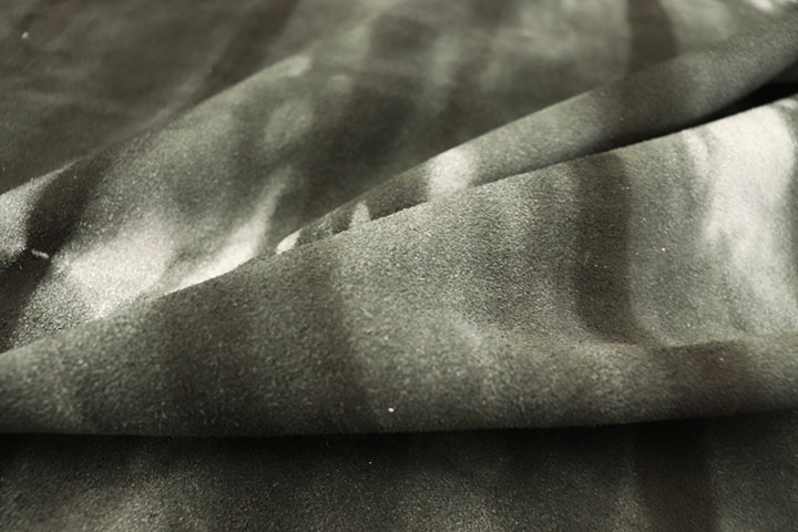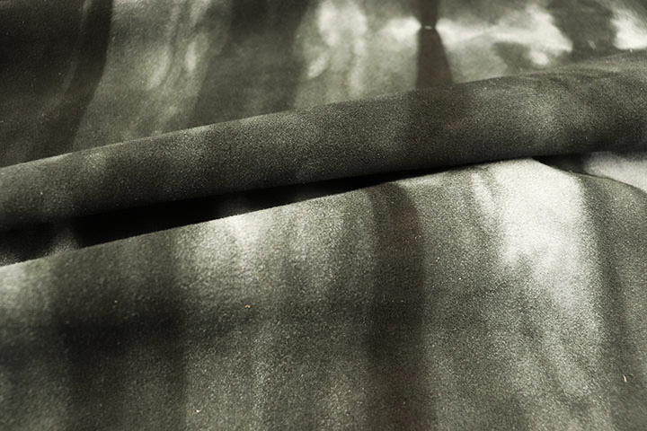 • Midnight Marble is a bold black suede with a striking white tie-dye pattern that creates a mesmerizing, marble-like effect. Its unique contrast of deep black and soft white swirls evokes the mystery and elegance of a starlit night. The velvety texture of suede adds a tactile richness, making it perfect for statement pieces in modern or eclectic spaces. Midnight Marble brings an edgy yet sophisticated vibe, ideal for those looking to make a dramatic design statement. Approx weight of hide: 2.6 oz/sq.ft. Approx thickness: 1.0-1.2 mm